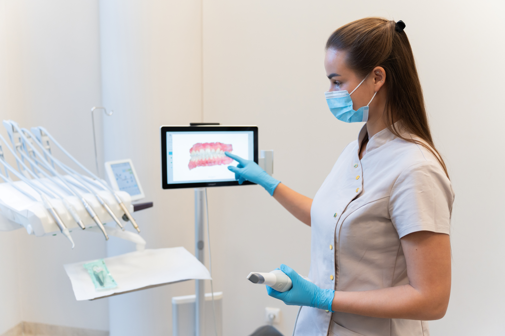 - Naudojant intraoralinį skenerį, nuimami dantų lankų atspaudai, pagal kuriuos pagaminamas individualus kapų rinkinys.