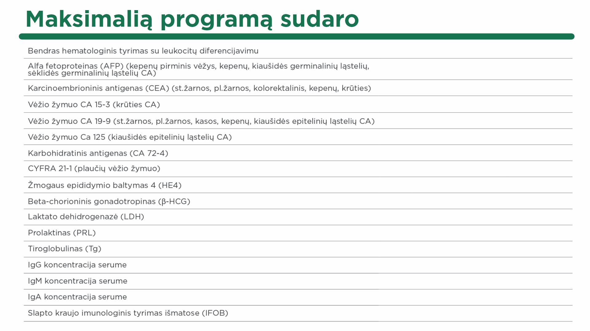 Vienas iš patikimų diagnostikos metodų – vėžio žymenų tyrimas iš kraujo. Šie tyrimai leidžia aptikti specifinius baltymus, kurie intensyviau gaminasi sergant tam tikra vėžio forma. Moterims skirta programa apima kiaušidžių, krūtų, kasos ir skrandžio žymenų tyrimus.