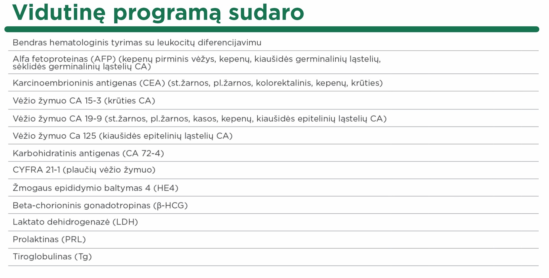 Vėžio žymenų tyrimai iš kraujo padeda aptikti baltymus, kurie gaminasi sergant tam tikromis vėžio formomis. Moterims skirta programa apima kiaušidžių, krūtų, kasos ir skrandžio tyrimus.