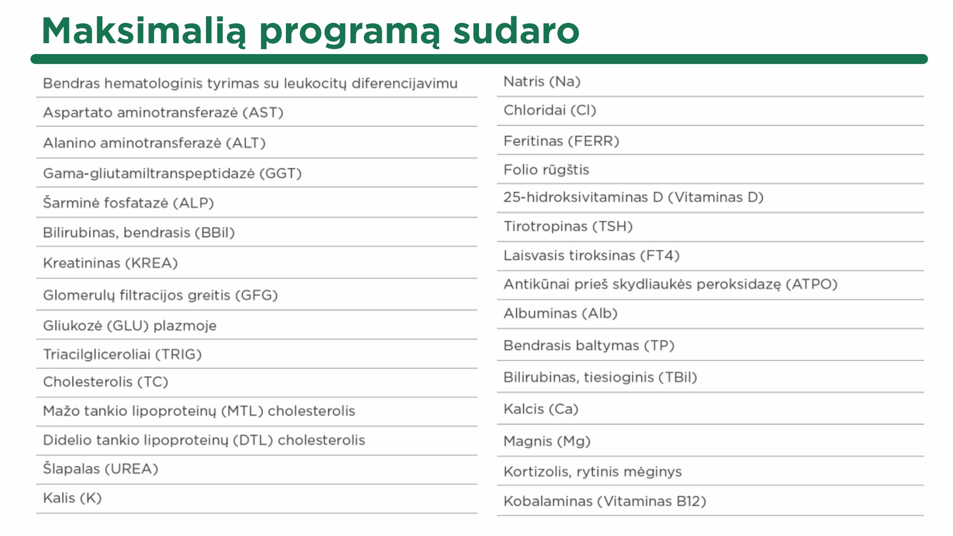 Programa rekomenduojama tiems, kuriuos kamuoja nuovargis 3–6 mėnesius ir jis nepraeina net išsimiegojus. Tyrimai padeda nustatyti, kokias organizmo funkcijas reikia atstatyti nedelsiant. Tokie rodikliai kaip feritinas ar vitaminas D gali atskleisti nuovargio priežastis.