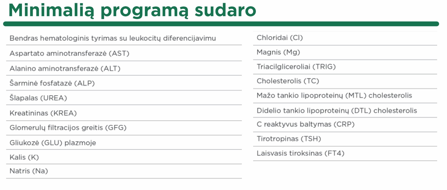 Sportuojančiųjų tyrimų programa apima širdies ir kraujagyslių rizikos vertinimą, mikroelementų ir vitaminų kiekio nustatymą.
