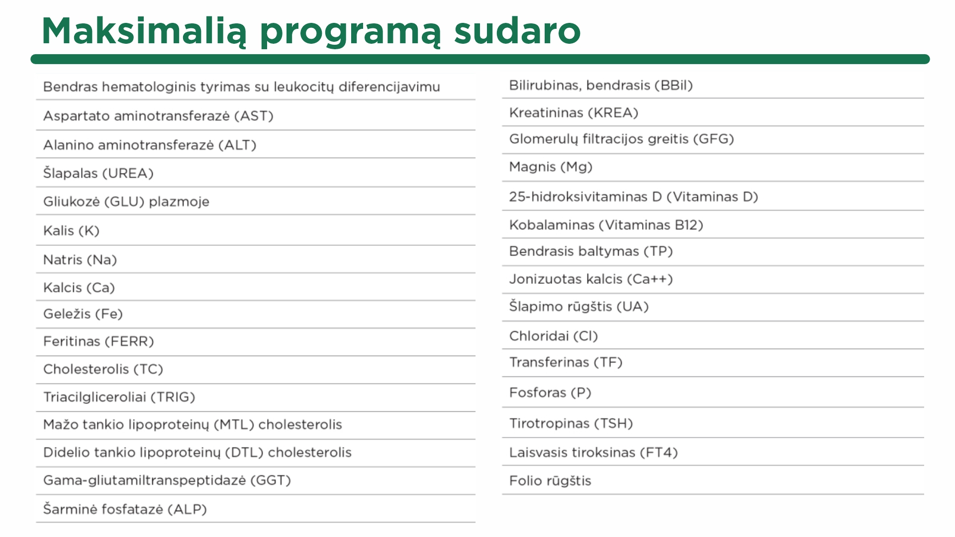 Dėl to gali trūkti svarbių maistinių medžiagų. Ši ištyrimo programa padeda įvertinti bendrą organizmo būklę ir nustatyti, ar mityba atitinka organizmo poreikius.