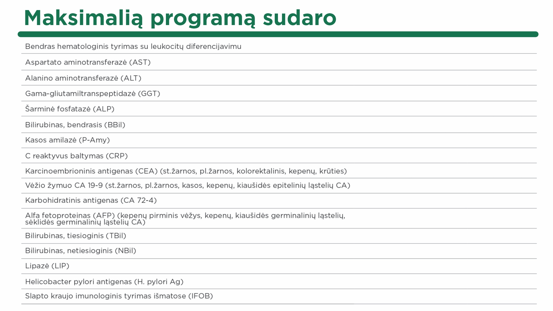 Gydytojų sudaryta kraujo tyrimų programa padeda įvertinti bendrą organizmo būklę ir virškinimo sistemos sutrikimus. Galima rinktis minimalią, vidutinę arba maksimalią programą.