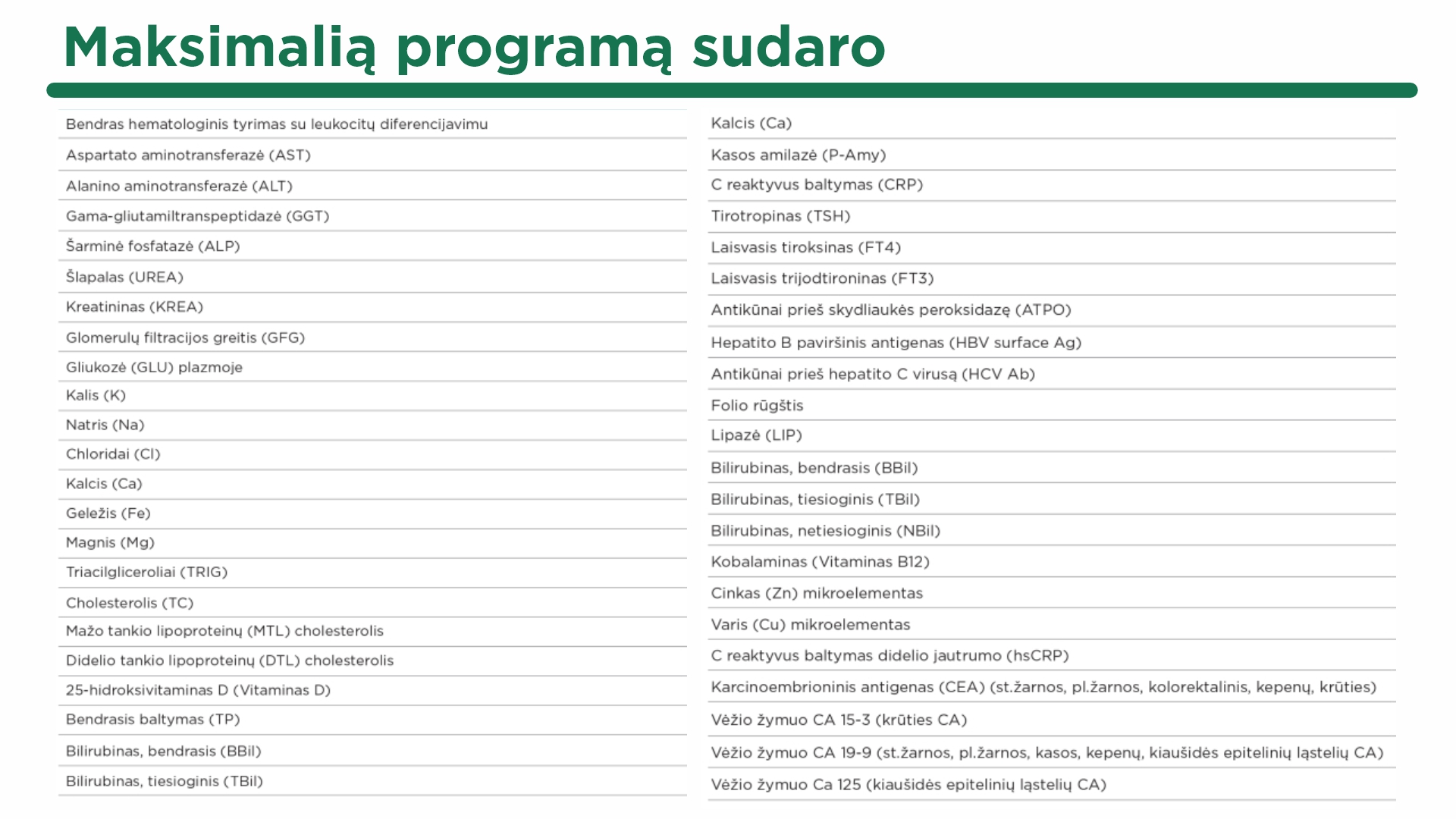 Reguliarūs tyrimai padeda laiku nustatyti sveikatos pokyčius ir užkirsti kelią ligoms. Vyro ištyrimo programa apima svarbiausius kraujo tyrimus, kurie leidžia įvertinti medžiagų apykaitą, širdies ir kraujagyslių būklę bei onkologinių susirgimų riziką.
